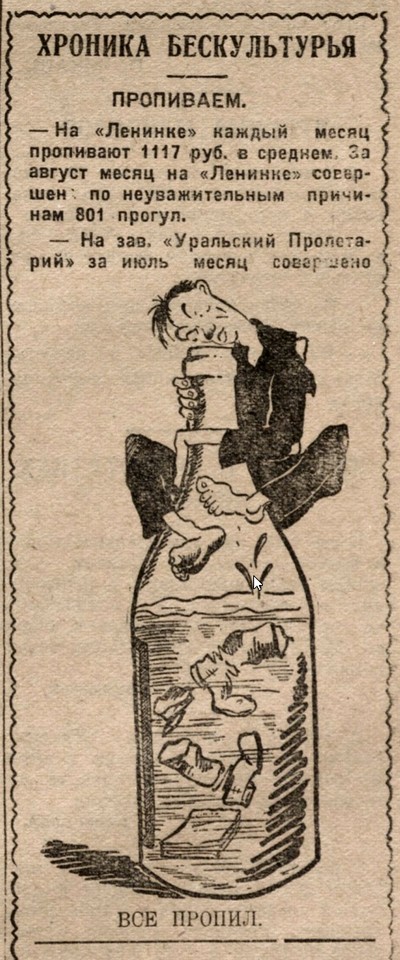Опубликованная 16 октября 1928 г. в «Уральском рабочем» заметка «Демонстрация детей против пьянства» написана лаконично, в ней нет эмоциональных картин с умоляющими детьми и плачущими от раскаяния отцами, но она добавляет значимости самой идее: дети протестуют, и успешно не только на Урале.