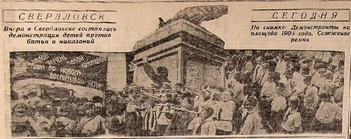 Международный день защиты детей отмечается ежегодно начиная с 1950 года. В Свердловске «демонстрация детей против битья и наказаний» прошла 25 мая 1930 года. На следующий день газеты «Уральский рабочий» и «На смену!» увлеченно рассказывали о том, как под треск барабанов и раскаты горнов колонны детей, с транспарантами и болтающимися на палках веревками и ремнями, двигались в сторону площади 1905 года. В каждой колонне были карнавальные фигуры пьяниц-отцов, впереди несли черный гроб с ремнем, веревкой и полбутылкой водки. Кульминацией парада стало сожжение гроба, поставленного на пьедестал бывшего памятника.