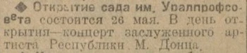 Что ожидало свердловчан в садах? 13 июня газета сообщает, что «сегодня в саду Уралпрофсовета устраивается общегородской вечер молодежи»: на спортплощадке – футбольный матч между городскими командами, в саду – выставка с беседами «об основах советской физкультуры», в читальне – шахматный турнир, в тире – стрелковые соревнования, на эстраде – лучший гармонист. 27 июня – анонс развлечений на первую половину июля: «С 1 по 15 июля предполагается выступление цирковой труппы. В программе балетные номера, акробаты, жонглеры, трюки в воздухе, полеты, клоуны и т. д. 29 июня и 1 июля предполагаются гастроли знаменитого артиста оперы баритона Мигай, который даст в саду два концерта. В скором времени в саду будут гастроли вокального квартета Мусоргского».